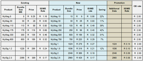 Customers buying MyMeg 100 will pay 39% less, with the price per megabyte reduced from 80c (for the previous MyMeg 110) to 49c, according to Vodacom (see full table below).