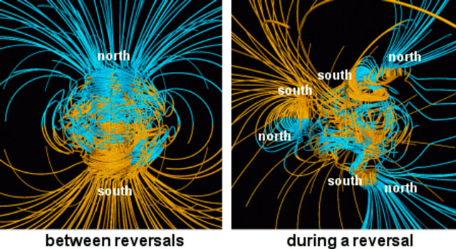During a reversal, the magnetic field won’t be zero but will assume a weaker and more complex form. It may fall to 10% of the present-day strength and have magnetic poles at the equator or even the simultaneous existence of multiple “north” and “south” magnetic poles.