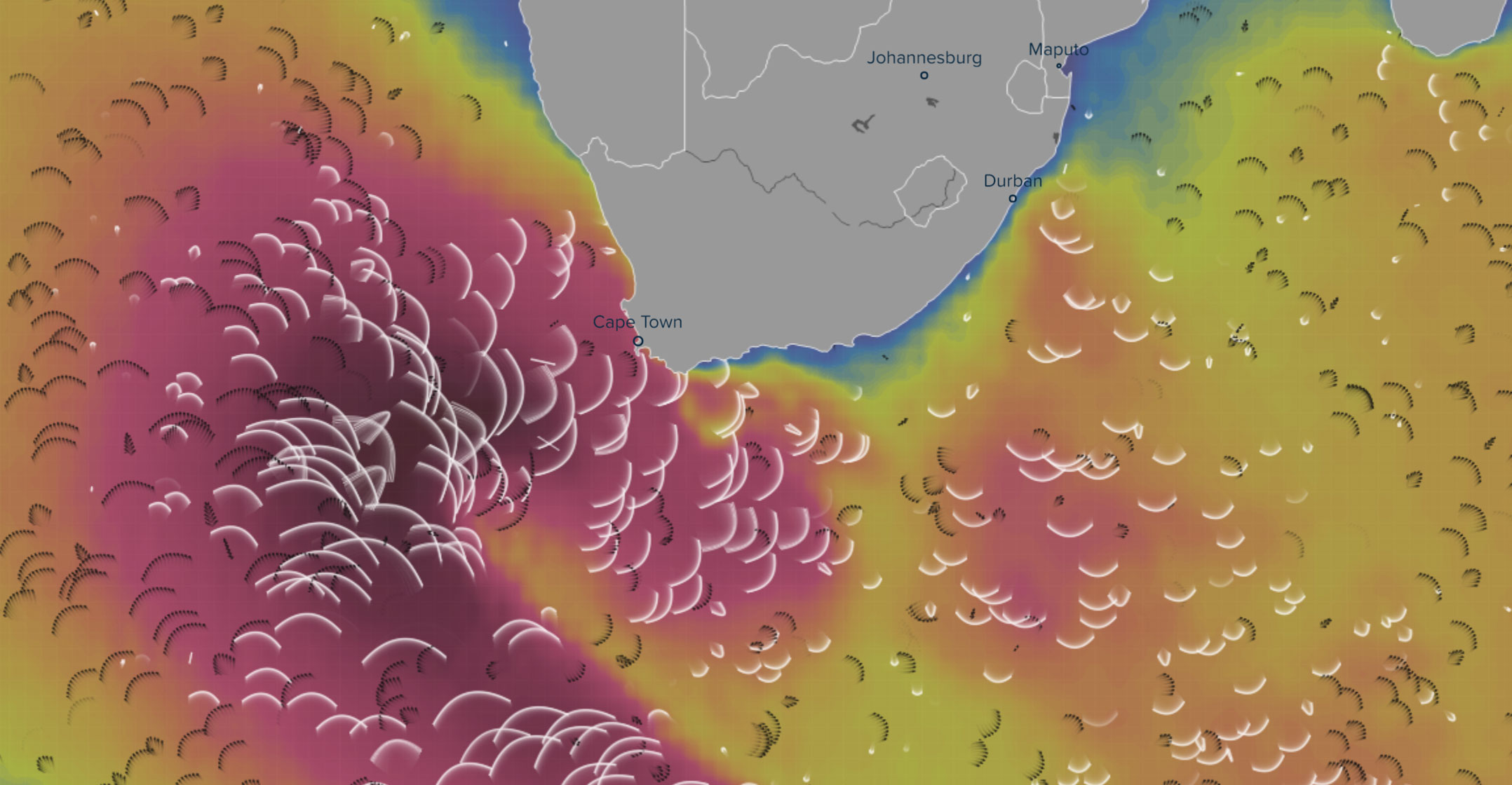 The Ventusky website, which provides a wide range of interactive meteorological data — including wind speeds, wind gusts, air pressure, clouds, rain, temperature and wave height — showed the core of the storm still lying to the west and southwest of Cape Town at 8am on Wednesday.