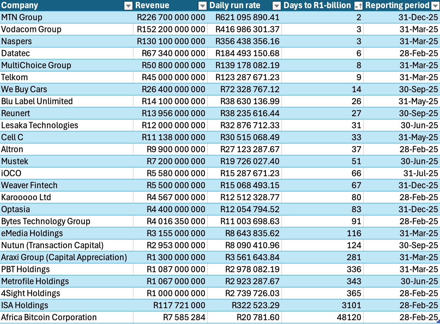 At the tail end of the table, ISA Holdings, the niche IT services business, would take 3 101 days — roughly eight-and-a-half years — to generate R1-billion at its current daily run rate of R322 523. Africa Bitcoin Corporation, which generates an average of R20 782/day, would need 48 120 days — approximately 132 years. — (c) 2026 NewsCentral Media