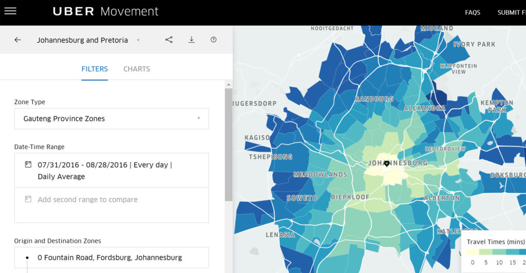 Gauteng has become the first region in Africa to become part of Uber Movement, Uber’s free website that provides the public and urban planners with anonymised data about traffic flows. The website provides detailed information